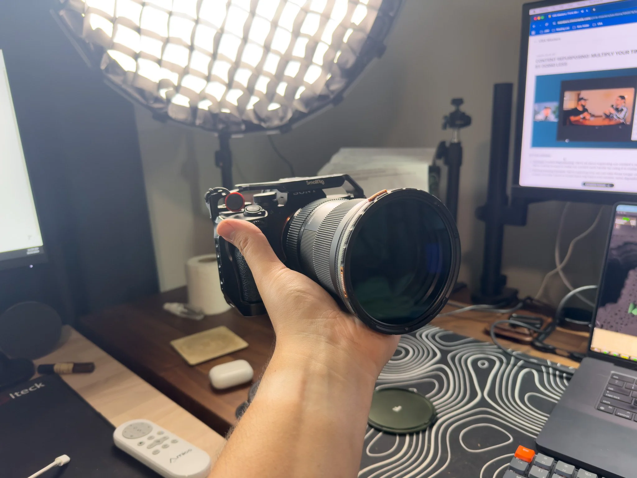 To the left of my monitor is my Sony A7 IV paired with a Sigma 24-70mm f/2.8 lens. It’s hooked up with a power supply.